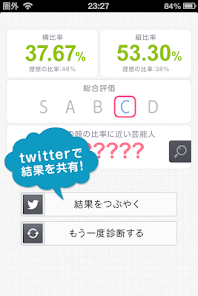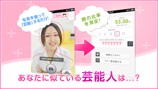 顔写真を撮影すると、あなたの美顔レベルとどの芸能人に似ているかを診断。顔をS~Dの5段階で評価します。