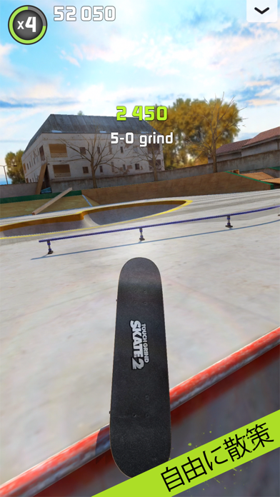 スケボーの操作に必要になるのは2本の指のみ。広大なステージをさっそく滑ってみてください。2本指、でスケボーを操る感覚に慣れるまでが大変ですが、1本指でブレーキ、スワイプで視点変更など細かい動作を先に覚えてしまえば、すぐに手足の一部のように操ることができます。