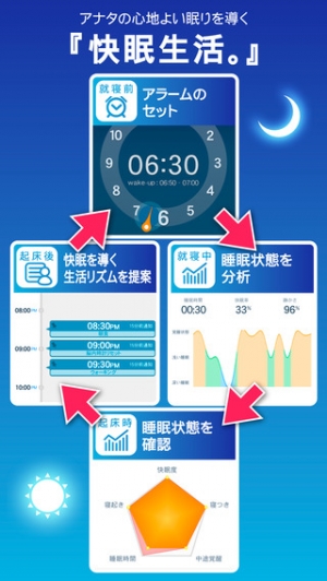 1日のスタートがブルーだと、その日はずっと気分が上がらないこともあるでしょう。気持ちのイイ1日を過ごすためにも、本アプリに素敵な睡眠をプレゼントしてもらってはいかがでしょうか。