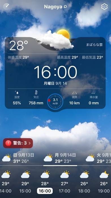 画面いっぱいに広がるアニメーション背景で、その地域の空模様がひと目でわかります。青空、雨、雪など、自然そのままの雰囲気を楽しめる見た目が特長。自分の好みに合わせて気温、風、湿度などの表示順も自由に変えられます。毎朝アプリを開くのがちょっと楽しくなりそうですね。