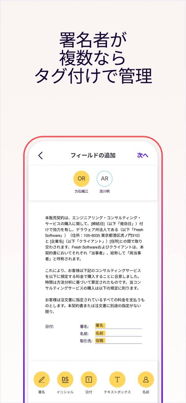自分のサインを登録し、それをスタンプのように文書に貼りつけられるアプリ。フルネームの手書きサインとイニシャルのサインを登録します。あとは署名したい書類データに、手書きサインのスタンプを貼っていくだけ。