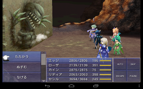 やはりこの時代のFFシリーズは、最高に面白い。 FF3より、操作もしやすく、バトルにオート機能がついたので、雑魚戦もサクサク進む! しかもそのオートも、行動を記憶できる。これが地味に便利。 このゲームはATBなので、例えばテラでアイスロッドを使いたい場合、アイテムからアイスロッドを選ぶのが手間だったりするが、オートにしておけば、毎ターンそのコマンドになるので、魔法キャラのコマンドを選ぶ手間が省けるって寸法です。 しかも、DS版より、音質が良くなっている!