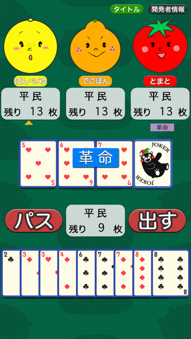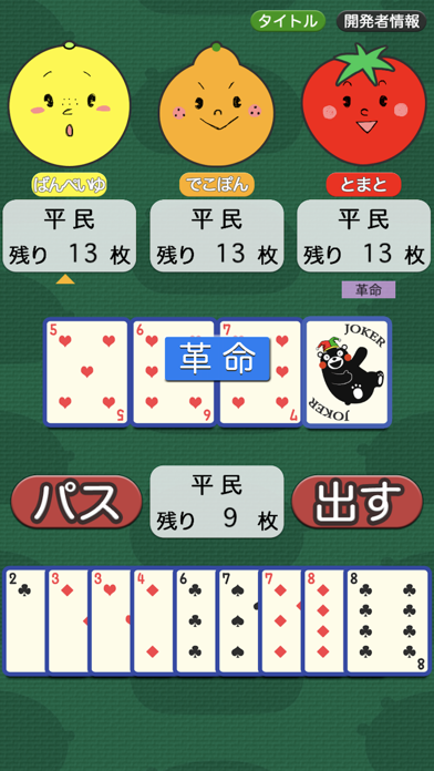 CPUと4人対戦の大富豪をいつでもどこでも楽しめます。ただ画像のように「2」の位置がバラバラになってしまうなど、改善の余地はありそうな印象。熊本の名産品たちと戦ってみましょう。