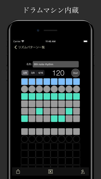 リズムの練習を助けるシンプルなドラムマシン機能も搭載。ユーザー自身でリズムパターンを設定し、それをドラムマシンとして使用できます。リズムパターンはAirDropやメールで送信することも可能。より高度なギタープレイを楽しむことができるでしょう。