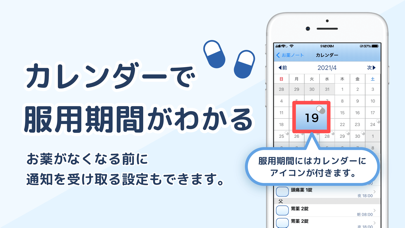 服用チェックやカレンダーなどの、サポート機能も充実しています。登録したお薬にチェックをつけると、カレンダーに自動でアイコンを表示。忙しい日々の飲み忘れをサポートします。