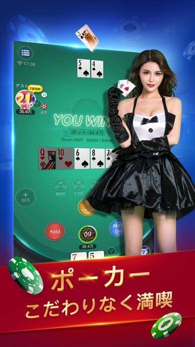 オンライン対戦でテキサス・ホールデムを遊べるアプリ。BETやRAISEはタップ操作で行えるので、直感的な操作で遊びやすいのが特長。各自15秒の持ち時間しかなく、テンポよくサクサクと遊べるのも嬉しいポイントです。