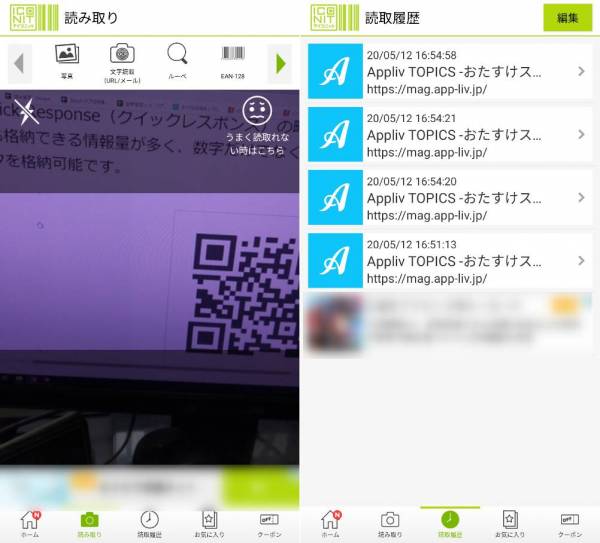 ▲『ICONIT』のQRコード読み取り画面(画像左)と履歴画面(画像右)。