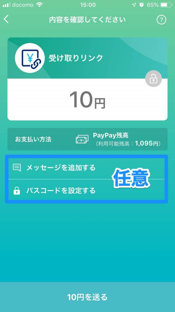 5. 内容を確認。必要ならメッセージやパスコードを設定して[○○円を送る]