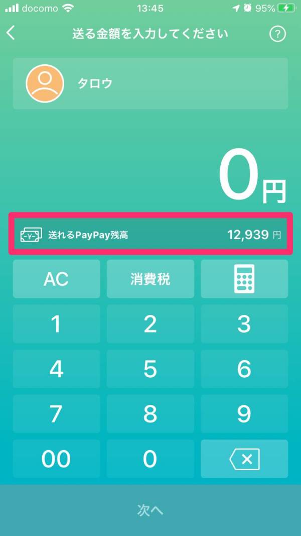 送金額を入力する画面には「送れるPayPay残高 ○○円」と書かれています。