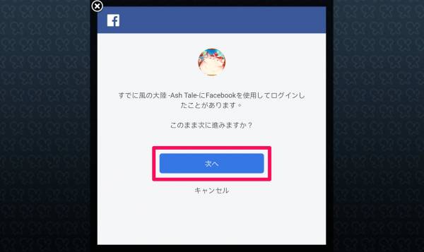 Facebookのログインに成功すると、「すでに風の大陸 -Ash Tale-にFacebookを使用してログインしたことがあります。」というメッセージが出ます。