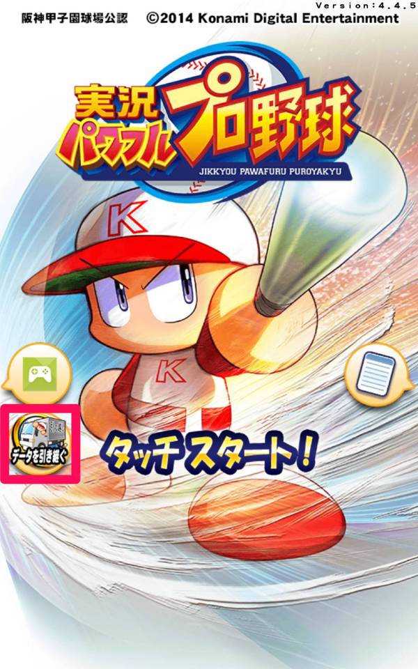 1.パワプロを起動し、タイトル画面の[データを引き継ぐ]をタップ