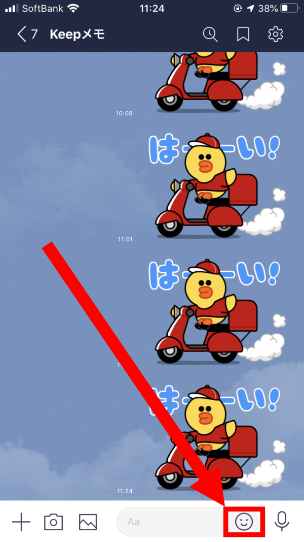 1.トークルームで送りたいメッセージを入力し顔マークをタップ