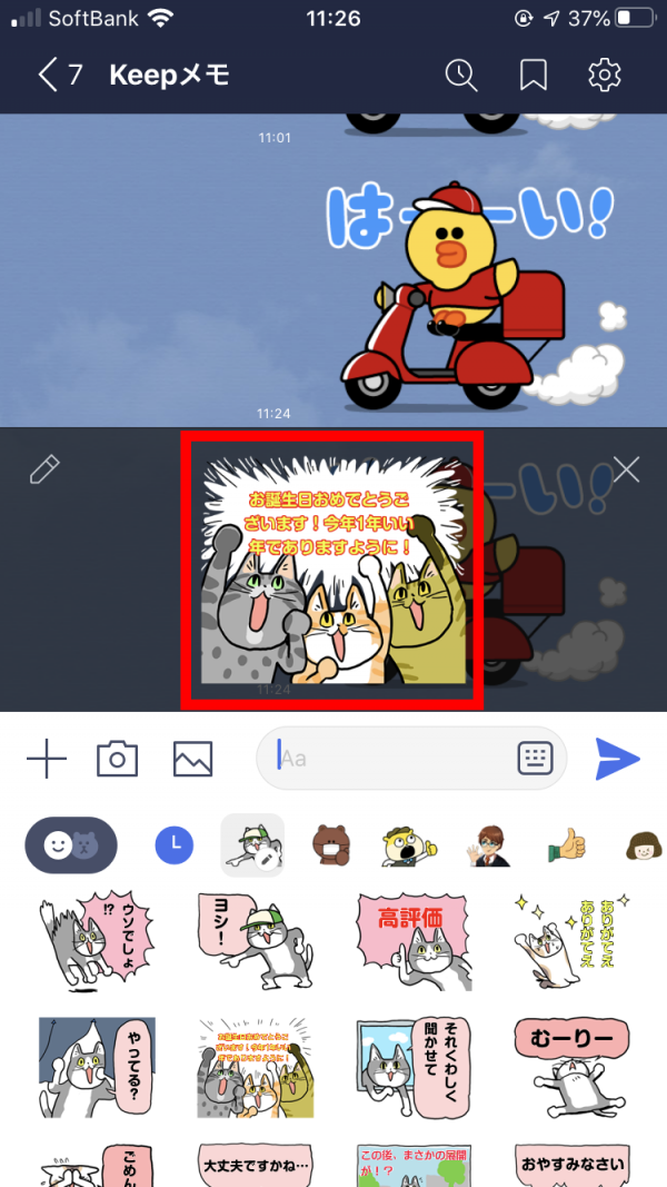 「メッセージスタンプ」を使いたい場合、文章をスタンプ自体に保存する方法と毎回入力する方法があります。よく使う文章ならスタンプ自体に保存、あまり普段は使わない文章なら毎回入力、といったように使い分けることをオススメします。