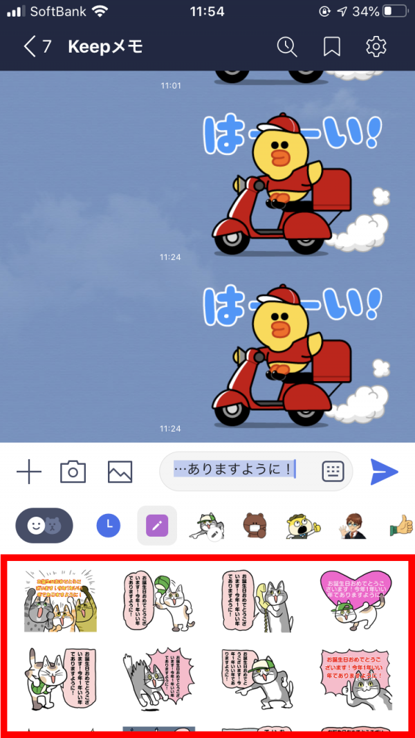 以前使ったときに保存している場合は、通常のスタンプと同じように使えますが、毎回入力する方法で作った場合は、スタンプ使用履歴から探して使う必要があります。