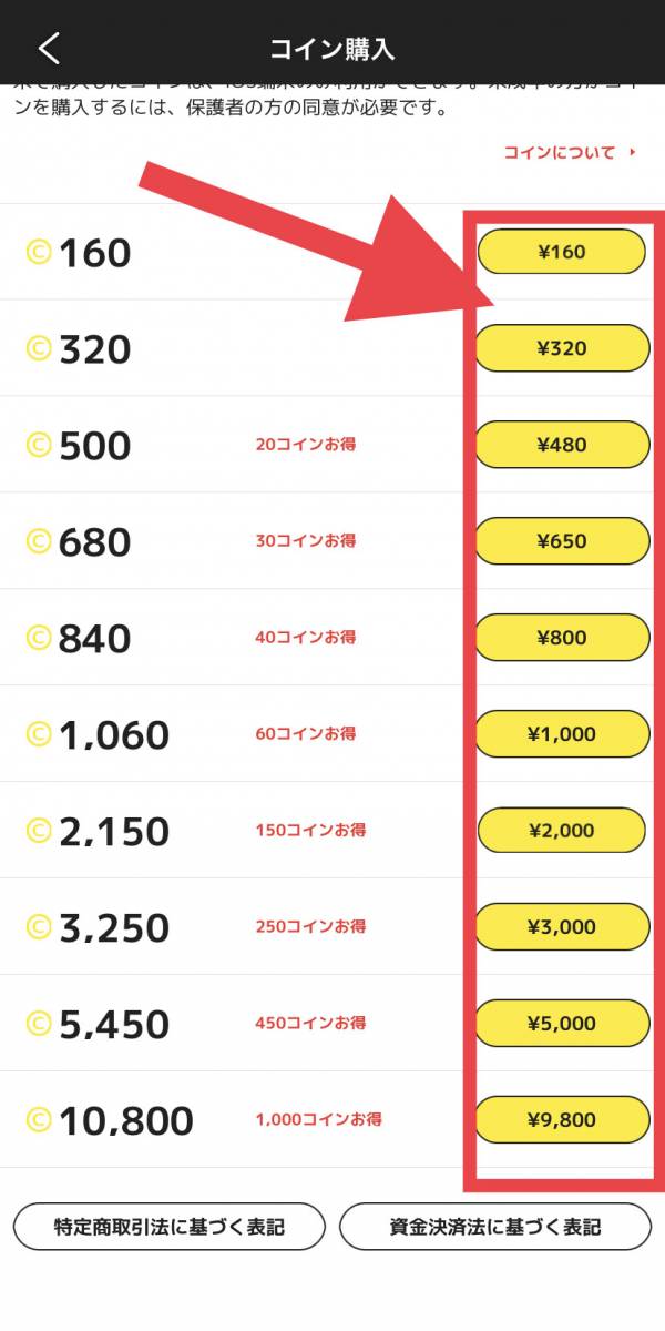 購入コインは、アプリ内で実際にお金を支払って購入します。以下に、購入コインの料金表と購入手順を紹介します。