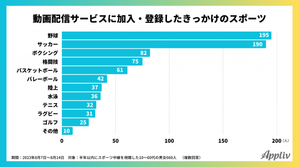 続いて、新規加入・利用のきっかけとなったスポーツを尋ねた結果、TOP3は「野球(195人)」、「サッカー(190人)」「ボクシング(82人)」でした。