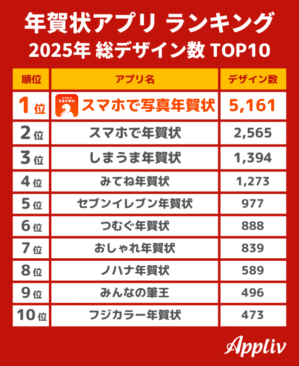 アプリブが毎年独自に行っている、年賀状アプリのデザイン数調査の2025年版の結果がこちら。