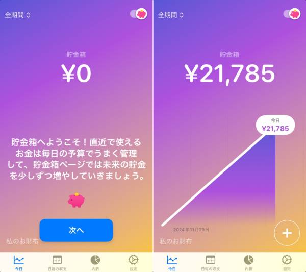 ▲「貯金箱」では、毎日の節約でどれだけ貯金できたかをひと目で確認できる