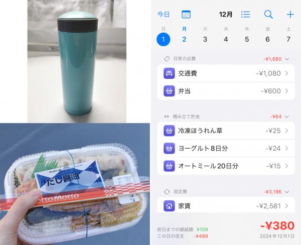 初日は自販機で飲み物を買うのをやめ、水筒を持参することにしました。それ以外の食事は宅食弁当を利用。筆者は普段、1日に2〜3本のペットボトル飲料を自販機で購入する習慣があり、その分の出費を削減できました。その結果、1日目にして+100円の余裕を確保。節約初日としては上々のスタートです!