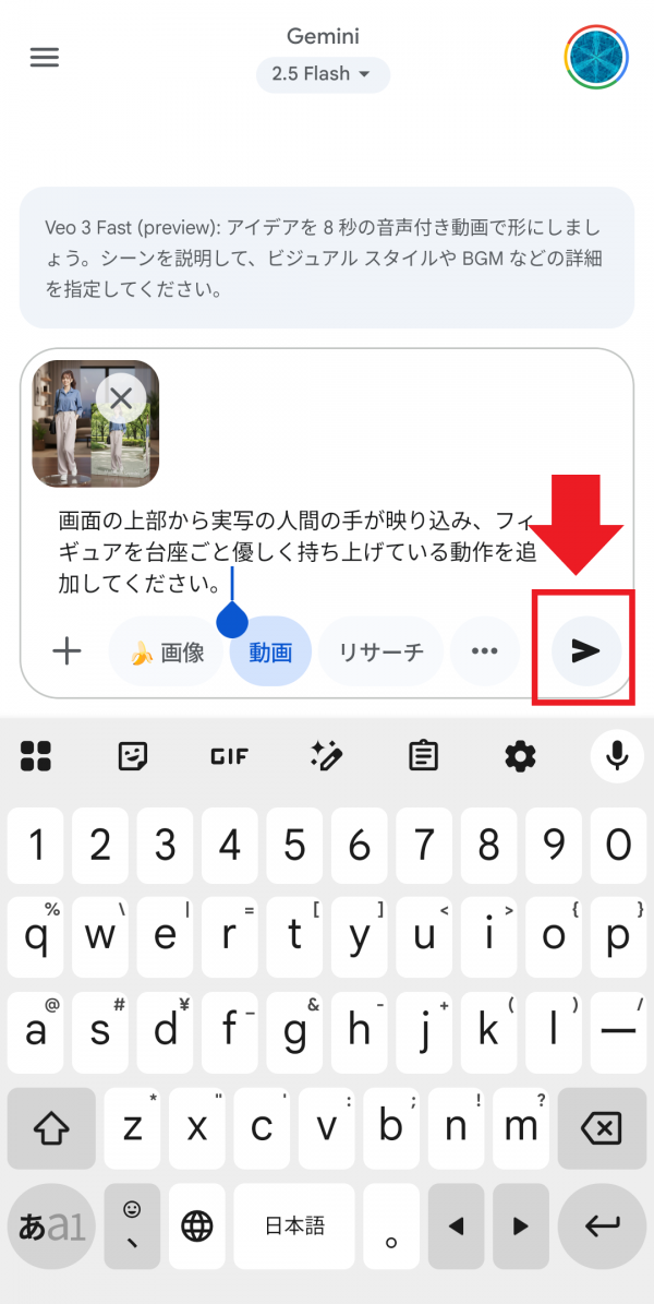 紙飛行機アイコンをタップすると、数分で処理が完了し、写真がフィギュア風に変換された画像が出力されます。