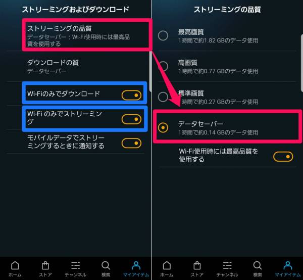 [マイアイテム]→画面右上の歯車ボタン(設定)→[ストリーミングおよびダウンロード]→[ストリーミングの品質]→[データセーバー]でモバイルデータ時の動画視聴の通信量を最小に抑えてくれます(1時間に約0.14GB)。