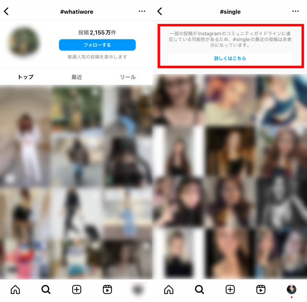 しかしガイドラインに違反している場合、右側の「#single」のように各タブの表示はなく、注意事項が記載されています。このハッシュタグは、なるべく使わないようにしましょう。