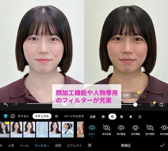 目元を強調するなどの肌の美肌補正はもちろん、AIによるイラスト化や背景の自動削除・ぼかし機能まで幅広い機能がそろった万能型アプリです。フィルターやテンプレートも豊富で、ナチュラルな仕上がりから個性的な演出まで加工が自由に行えますよ。