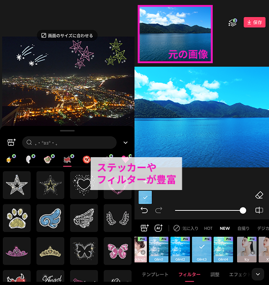 ▲フィルターを使うと、さらに幻想的な雰囲気に(右がフィルター加工後の写真)