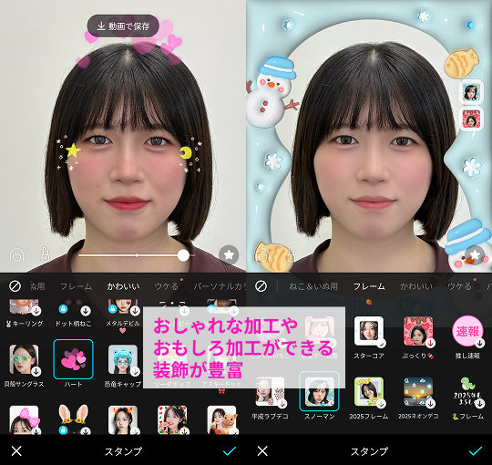 スタンプやARエフェクト、フレームなど遊び心のある装飾機能が豊富な点も魅力です。シンプルな自撮り加工はもちろん、写真を使って友達と楽しめますよ。