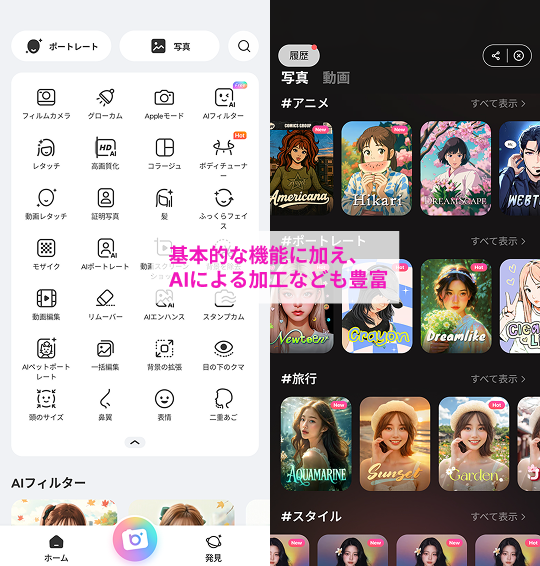 顔加工からAIイラスト化まで機能が充実
