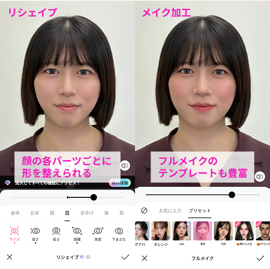 - 顔の各パーツや体型など、顔加工の機能が豊富