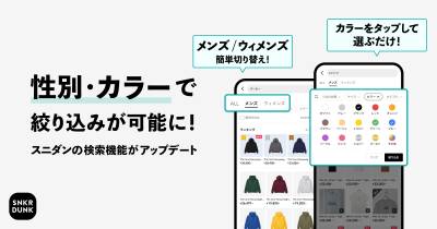 「SNKRDUNK(スニーカーダンク)」(以下、スニダン)を運営する株式会社SODA(本社:東京都渋谷区、代表取締役CEO:内山 雄太、以下SODA)は、2026年4月16日に、スニダンアプリの検索機能のアップデートを実施します。性別に基づくアイテムの切り替えとカラーを”1タップ”で絞り込めるようになり、視認性と検索機能を強化することで、より欲しいアイテムに出会いやすくなりました。