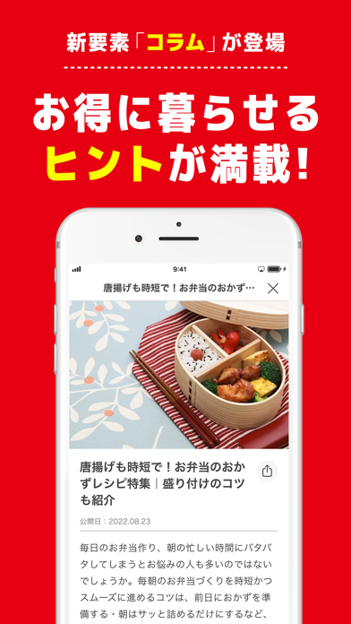 チラシのブックマークやメモ機能に加え、レシピやコラムなど、買い物前後のお役立ち情報までトータルで提供しています。
