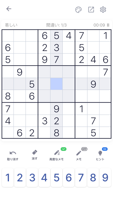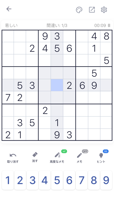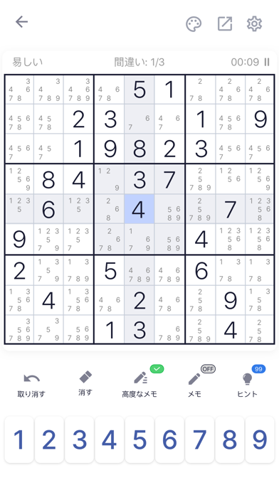 9x9のマスに数字をすべて埋めるのが目的になります。タテ・ヨコの列と3×3のブロックに同じ数字が入らないよう、慎重に確認しましょう。メモやヒントを駆使すると、当てはまる数字が徐々に絞り込めますよ。
