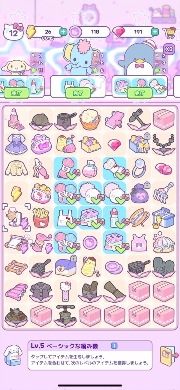 同じアイテム2つを合成し、毛糸やシャツなど新しいアイテムを作るパズル。注文されたアイテムをそろえればミッションが進行し、ショップも発展します。毛糸玉はシナモン、絹糸はポチャッコなど、キャラクター風のアイテムデザインがまたキュート!
