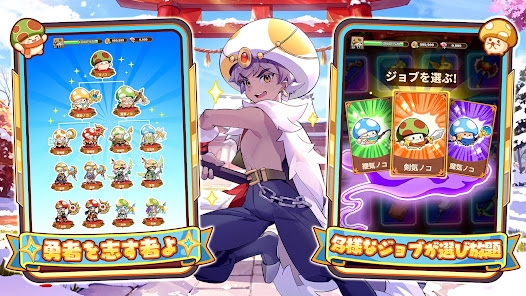 ゆるい雰囲気の中、気軽に遊べる放置RPGです。キノコ一族の勇者が魔竜と壮絶な戦いを繰り広げるも苦戦。そこでランプの女神は勇者を100年前の世界へと送り、修行をさせるのでした。