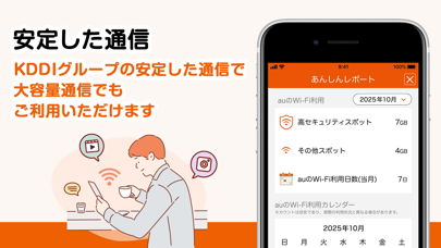 全国のカフェや駅などに設置されたauのWi-Fiスポットに自動接続できます。動画視聴や大容量ダウンロードも通信量を気にせず利用できるように。月ごとのWi-Fi通信量も表示されるため、どれだけデータを節約できたかが一目瞭然で達成感も得られます。