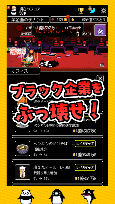 ペンギンたちは自動でも出社してきますが、入り口をタップすることでペンギンを増やすことができるので、たくさんのペンギンを出社させてブラック社員のHPを削っていきましょう。
