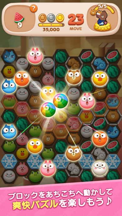 人気ゲーム『LINE POP』が進化して登場。マスが六角形になったことで消し方のバリエーションも増えています。X字型、Y字型など消し方によって現れるアイテムの種類も変化し、より戦略性と爽快感にあふれるゲームに仕上がっていますよ。