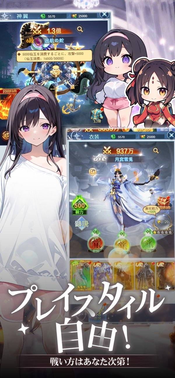 深いことは考えず、ポチポチ&放置で遊べるお手軽RPGです。神将(女神)たちが猛火を轟かせながら、天界らしき世界で無数の敵と激しい戦いを繰り広げます。画面は派手ですがバトルはオート、経験値稼ぎに至っては放置でOK。気軽に始められてどんどん自動で強くなっていくコンパクトなプレイ感です。