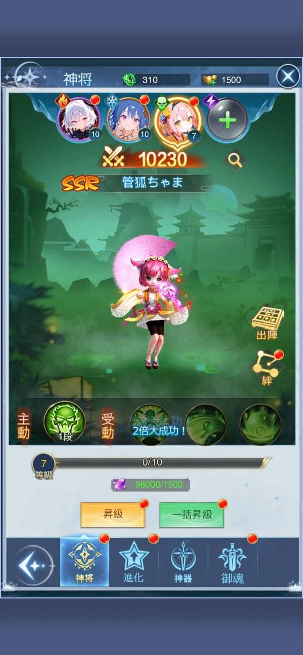 数あるシステムの中でもやはり神将の存在が目玉。男性の神将も存在しますが、女性が多く登場します。和風と中華風がモチーフの神将が多めで、洋風もわずかに存在するごった煮感が特徴。入手手段は主に召喚(ガチャ)で、ゲームを進めることでも続々と回せるようになっています。
