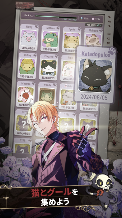 序盤からたくさんのイケメングールが登場します。好青年、俺様、クール、戦闘狂など、何ともツボを押さえた顔ぶれとなっており、その数20名以上。不思議と不気味と猫がいっぱいの世界で誰を推すのか、本当にいい意味で悩ましいです。