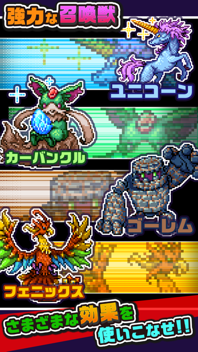 ユニコーンやカーバンクルなどの召喚獣を仲間にできます。強化メニューからコイン消費で追加が可能。それぞれのスキルが使えるようになり、ステージを有利に進められるように。強大な召喚獣を使役できるロマンも詰まっているゲームです。