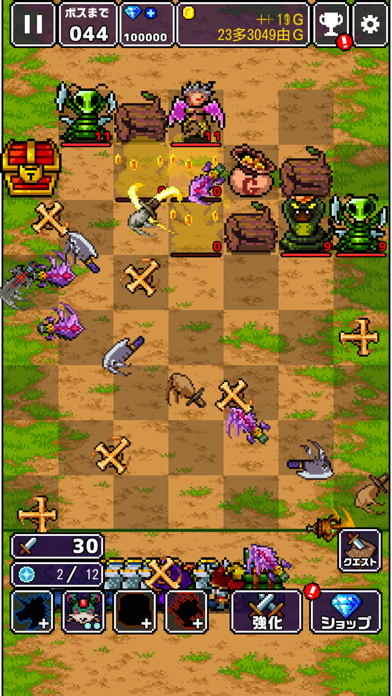 画面をスワイプして狙いを定め、指を離して攻撃。ブロック崩しのような操作感で、1ターンごとに1マスずつ迫ってくる敵を倒していきます。連続して反射すると、敵に一気にダメージが通り爽快感があります。