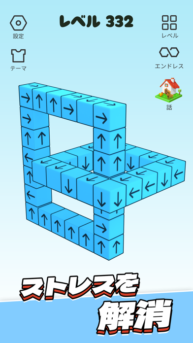 タップでブロックを1個ずつ塊から抜いていきます。しかし、各ブロックに描かれた矢印の方向にしか動かせず、移動先にほかのブロックがあるとぶつかってしまいます。スワイプでキューブを回転させて、さまざまな角度から動かせるブロックを探しましょう。