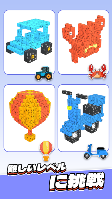 空間認識能力を脳トレ感覚で鍛えられる3Dブロックパズルゲーム。多数の3Dブロックで構成されるキューブから、すべてのブロックを抜くとクリアです。ブロックはそれぞれ決まった方向にしか動かせません。そのため、あらゆる角度からキューブを見て、抜けるブロックを探していきます。全部のブロックを消せると、ストレス発散にも。