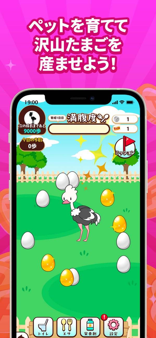 歩数に応じてペットがたまごが産む仕組み。歩数が多いと、上位の金のたまごが産まれやすくなります。