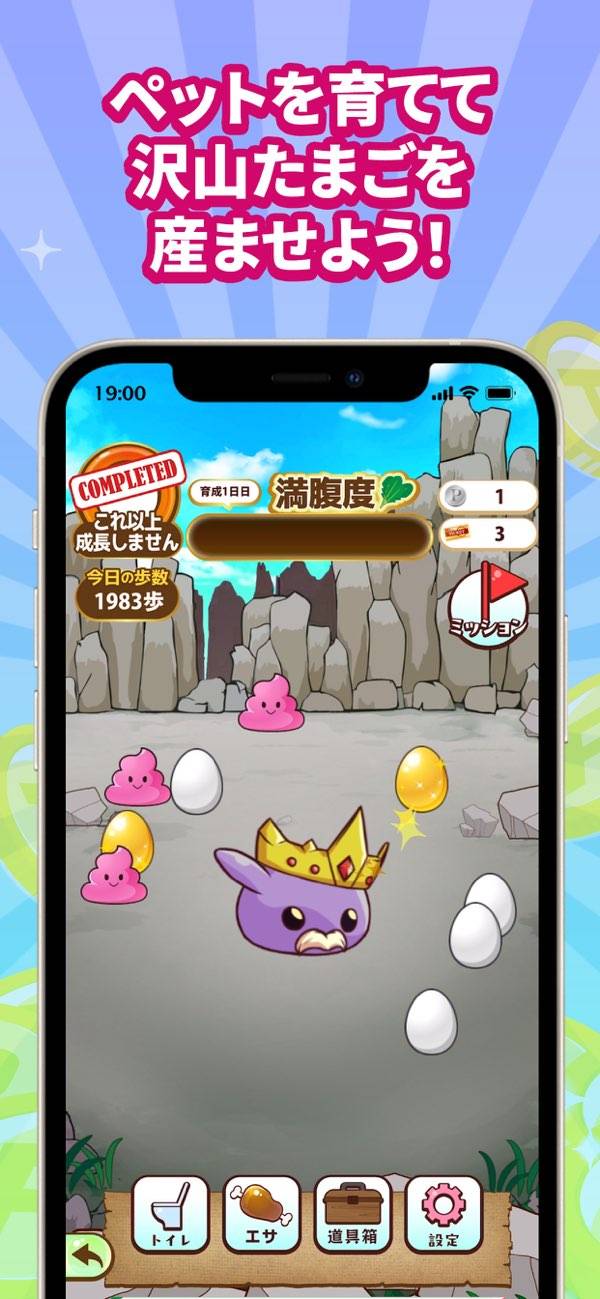 さらに累計歩数に応じてペットが進化。進化が進むほど金のたまごが産まれやすくなるのです。