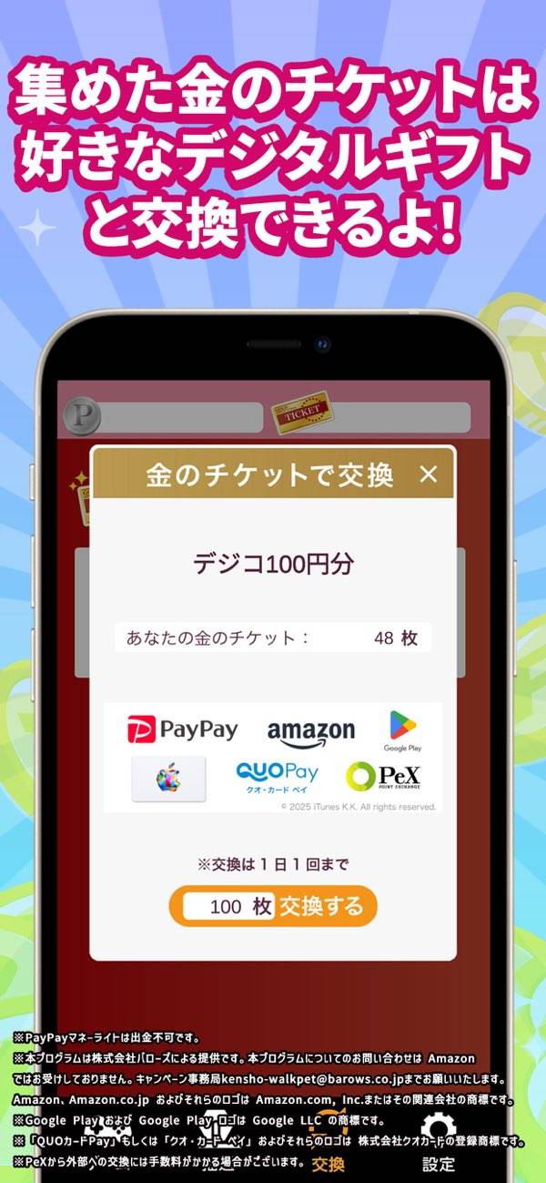 それとは別に「金のチケット」をデジコと交換可能です。相場は1チケット=1円ですが、一度に多くのチケットを交換するとよりお得に。