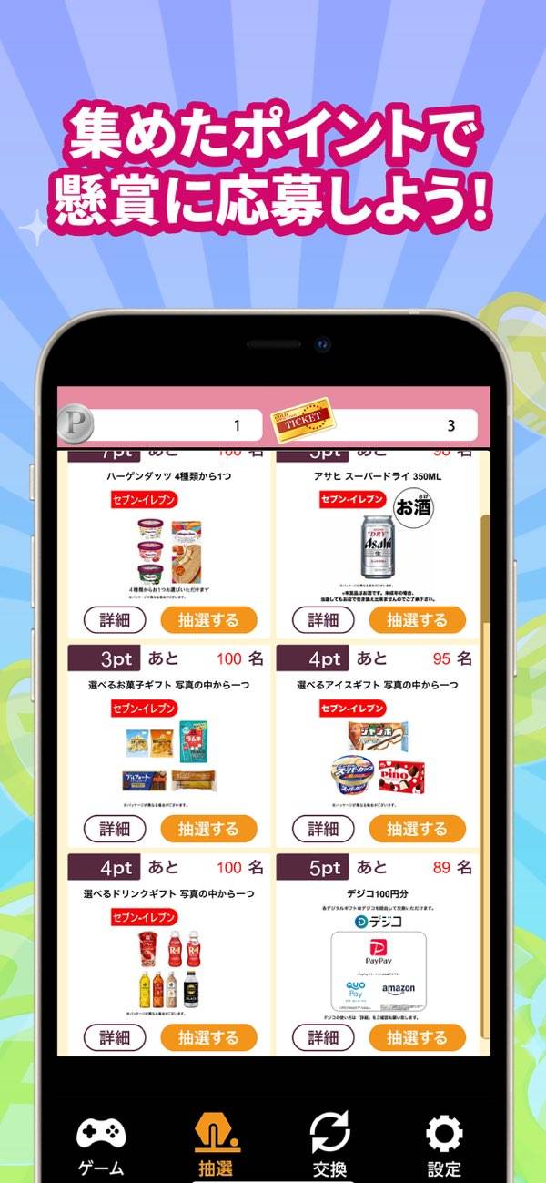 報酬はアイスやお菓子が運次第で当たる「抽選」と、確実にデジタルギフトのデジコがもらえる「交換」の2つの方式で展開。
